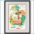 リゾート地ハワイの整備と空調完備の客船建造、こうしたインフラ整備とともにマトソンラインが取り組んでいたのは宣伝戦略です。写真を芸術の域に高めた貢献者、写真界のビッグネームとなっていたエドワード・スタイケンとアントン・ブリュールを起用し積極的な雑誌広告をリリース、同時に船内で使用されるメニューカードやパンフレット類にもハワイアンテースト溢れる美しいものを整えます。これらを手掛けたのはルイ・マックロードとフランク・マッキントッシュです。特にフランク・マッキントッシュの描くイラストは、ハワイ伝統のアロハ柄(ポリネシアの伝統柄でしょうか)を巧みに取り入れたもので、今日我々が感じるハワイアンテーストのイメージを構築したといっても過言ではありません。第二次世界大戦直前、マッキントッシュによって描かれたマトソンラインのポスター二種のうち、フラガールの図柄のポスターです