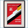 1960年代、NDLの客船事業末期に制作されたポスターです。この図柄はポスターだけではなく、セーリングスケジュールやアコモデーションなどの印刷物に幅広く使われたので日本でも馴染みのあったものです。セーリングスケジュールでは色違いのものも制作されましたが、ポスターはこの赤地の一種類のみが制作され、右下の寄港地名と言語違いで何種類かが存在しました。これは英語のシェルブール版です。大胆に記号化された船のデザインは秀逸ながら、戦後のポスターにも関わらず現存数が極めて少ないものです