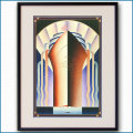 当商品は伊勢和紙に顔料インクを用いたアートプリントを国産材料で額装したものです。奥行きを持たせる濃淡色二重のダブルマット仕様です。伊勢和紙は伊勢神宮の奉書紙として漉かれ全国の神宮大麻に使用されています。インクジェットに意欲的で、伊勢和紙アート紙は新たな表現材料として世界中のアーティストに使用されています。マーメード紙程度の表面テクスチャーによる風合いが楽しめ、無酸性紙に顔料の組合せはリトグラフやシルクスクリーンに比べ格段の保存性を持ち、数十年単位の鑑賞に耐えます。画像データに傷や劣化の補修、彩度などの可塑修正を施し、テストプリントを繰り返し微調整して仕上げています
