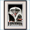 技術的限界があったスリーブバブルではあったものの、パナールは1925年には4気筒4.8Lエンジンの290モデルで185m/hの耐久世界速度記録を樹立、1930年代までは高級車メーカーとして大きな存在感を誇りました。そして、1920年代から1930年代を通じ、そのパナールの存在感をより確かなものにしていたのが、アレクシス・コウによる一連の美しい広告でした。アレクシス・コウは1901年モスクワ生まれ、ロシア革命を避けて一家はスイスに移住、ジュネーブ芸術工科学校に学びました。パリに移ったのは1920年頃、最初は自動車の車両設計会社(イタリアで言うカロッツェリアが近い)で自動車設計の職を得たようです。1922年パナールへ移籍、詳しい経緯は不明ながら最初は車両設計に従事したものと想像され、やがてアートディレクションでその才能を大きく開花させることになります。絵画からグラフィックデザインに入った殆どのアールデコ期デザイナー達とは違い、車両設計という異色の出自をもつコウの描く自動車は正確で精緻、さらに独特の感性で巧みにアールデコの流儀を吸収、恐らく歴史上最も美しい自動車の宣伝グラフィックを創出するに至りました。パナールとの雇用や契約関係が正確に伝わる資料は見当たりませんが、ホチキスやブガッティなど、少数ながら同業他社の広告も手掛けたものの9割方以上の仕事はパナールのものでした。本作は1932年のパナール6DS型(x66)の雑誌広告です。復刻版の大判オフセットポスターも多数出回っていますが、大判ポスターは存在せず本作オリジナルは雑誌広告です。1932年には、まだ左に描かれる客船ノルマンディーは未完成、完成予想図は早くから公開されており、進水した1932年10月にはすでに他の専門雑誌の表紙などにもかなり正確に船容が描かれていました。ただし、ここに描かれたノルマンディーはハウス形状やブリッジのウィング、ファンネルの大きさなどにやや正確性を欠き、どちらかと言えば1932年当時のフレンチライン旗艦、客船イル・ド・フランスをノルマンディーとして描いたように感じられます。右に描かれるのはフランス国鉄の241A型機関車、国際特急の機関車として活躍しオリエントエクスプレスを曳いたことでも知られ、ここに描かれた1931年製造の241-001-ETATは後にSNCF 1-241.A65に車両番号を変更して現在も稼働可能な状態で保存されています。中央の飛行機はフランス・ファルマンF.60ゴリアト、第一次大戦中に爆撃機として開発が進みましたが終戦を迎えて旅客機へ計画変更され1925年に運用開始、パリ-ロンドン間で史上初の渡洋商業飛行に就き14名の乗客を乗せることができました。背景に大きく描かれたのがパナール6DSのグリル、この広告で訴えたのは、下部仏語コピーに見られる通り、交通の発達はそれぞれの分野で目覚ましいものの、それぞれの間をつなぐものこそが自動車であり、自動車によってこそ移動の利便性が保証されるという、大げさに言えばいささか社会性を持つメッセージでもありました