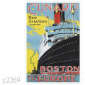 - p2683・・・1930年代に活躍したジャービスによるポスター。描かれるのはラコニア級客船。ジャービスは有名なクイーンメリーのオレンジ背景のポスターを描いたポスター画家ですが、詳しいことが判りません。リバプールの印刷会社に所属するインハウスデザイナーだったのではないかと思われます。上下と中央文字背景の塗りつぶし部分の色違いが数種類(赤、緑など)あります。このポスターはアイルランドで使用されたもののようで、アイルランドの図書館や博物館数か所でに保存所蔵されているのが確認できます。キュナードラインの社名入りのものもありますが、キュナードとホワイトスターの合併前後、1932年頃から1935年あたりまでに使用されたものと考えられます(Jarvis, ?-?)